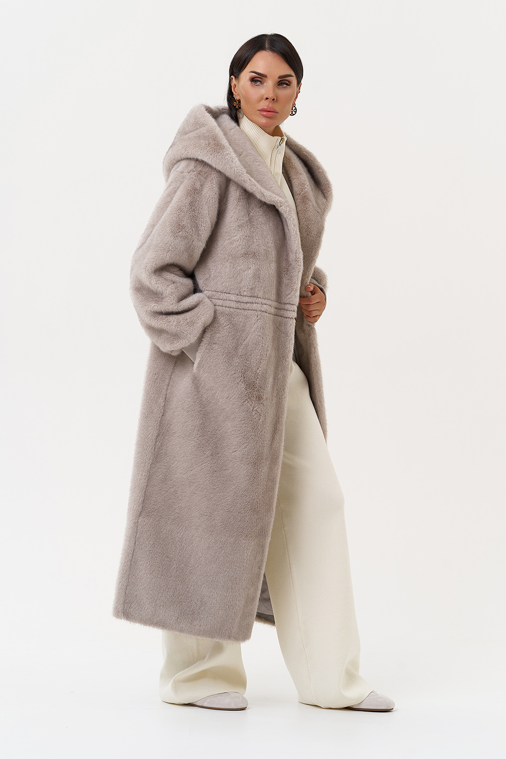 Фасон - прямой Длина изделия - 120 см Цвет - серый Материал - экомех Состав полотна - полиэстер 100% Подкладка - полиэстер 100% Вид застежки - молния, пояс, кулиска на талии Вид ворота - капюшон Фасон рукава - спущенное плечо, длинный |